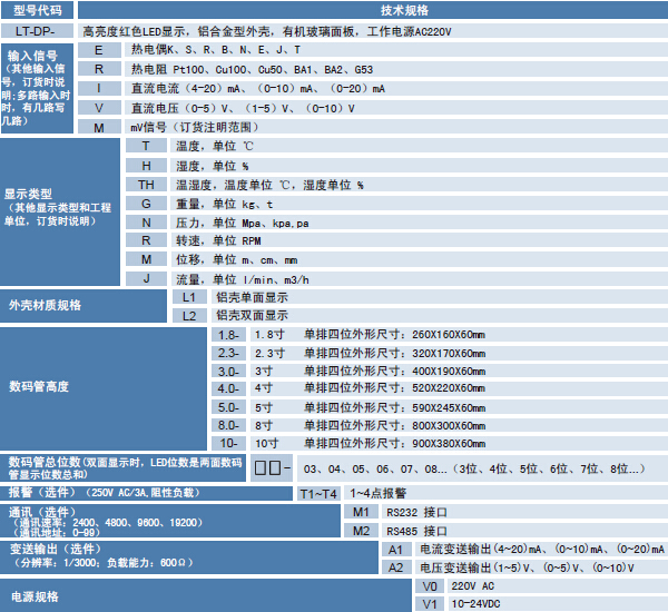 ¤ 顯示采用高亮度紅色LED,LED的尺寸包括1.8”,2.3”,3”,4”,5”,8”及10”(寸)。