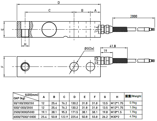 該傳感器彈性體采用剪切或彎曲懸臂梁結(jié)構(gòu),一端固定,一端受力,外形高度低,結(jié)構(gòu)強(qiáng)度高,可用于各種拉伸力和壓縮力的承載和測量,具有防塵密封、量程范圍廣、精度高、性能穩(wěn)定可靠、安裝使用方便等特點(diǎn)。 (量程范圍:0.05t - 10t)