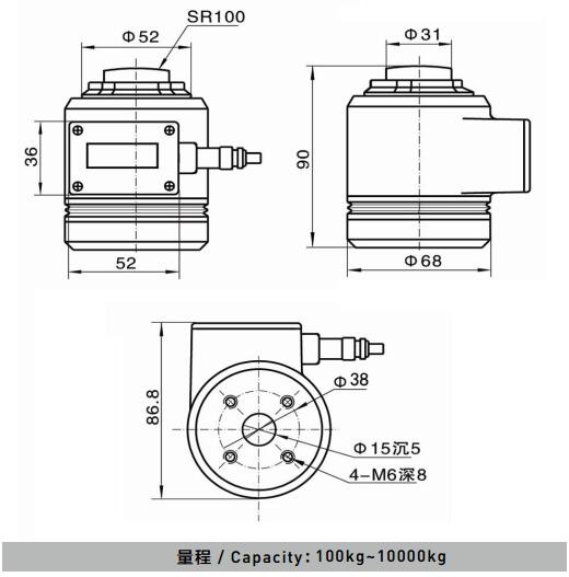10t及以下量程可選一體化顯示帶mV信號(hào)輸出(5-10VDC供電)或無(wú)顯示帶變送0~5V、4~20mA輸出,15-200t傳感器變送輸出需配外接式變送器 |