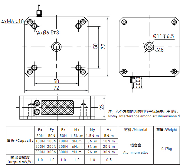 ¤ 額定載荷:力通道50N,100N,200N,300N 力矩通道1.5Nm,3Nm,6Nm,9Nm